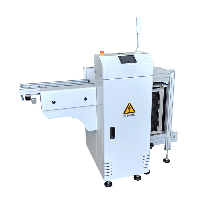 The Multi Magazine Unloader is used at the end of the line for unloading of PCB’s from the production line. An arriving PCB is taken up by the attached conveyor and then pushed into the magazine by the pusher. The magazine indexes to the next position and is ready for the following unloading cycle